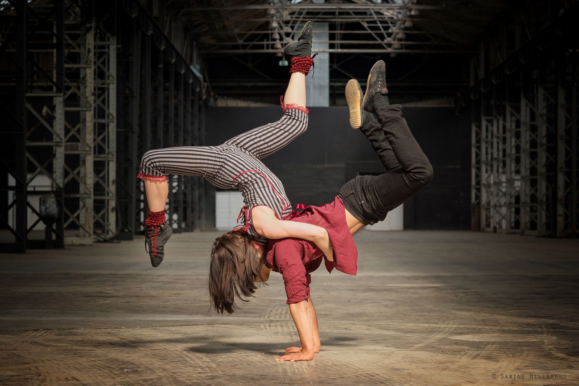 Ob an hohen Hauswänden performend, ob am Kran in schwindelerregender Höhe, ob akrobatisch am Trapez, am Tuch oder an Strapaten oder ob poetisch schwebend mit Indoor-Kites und Riesenfächern,