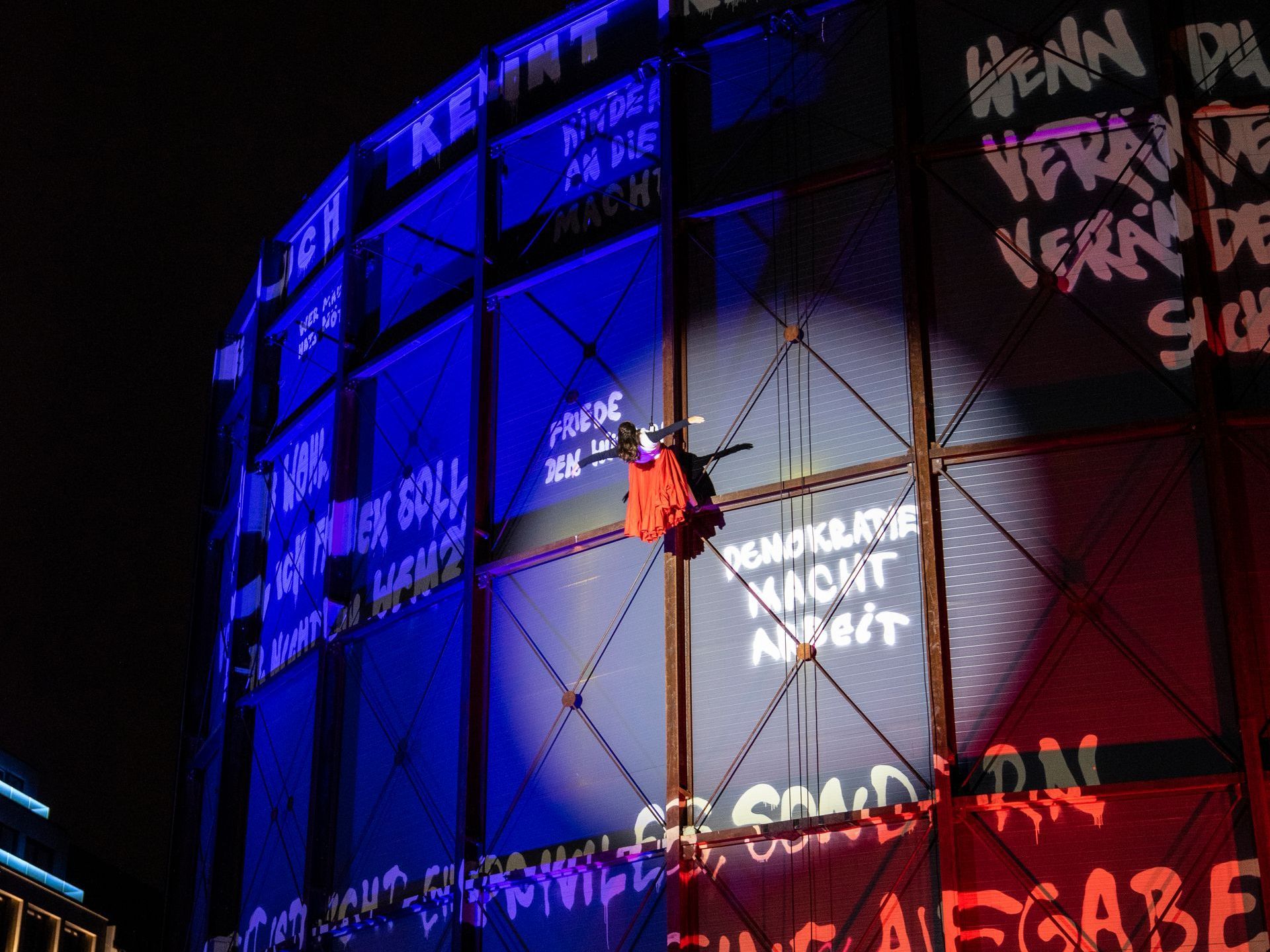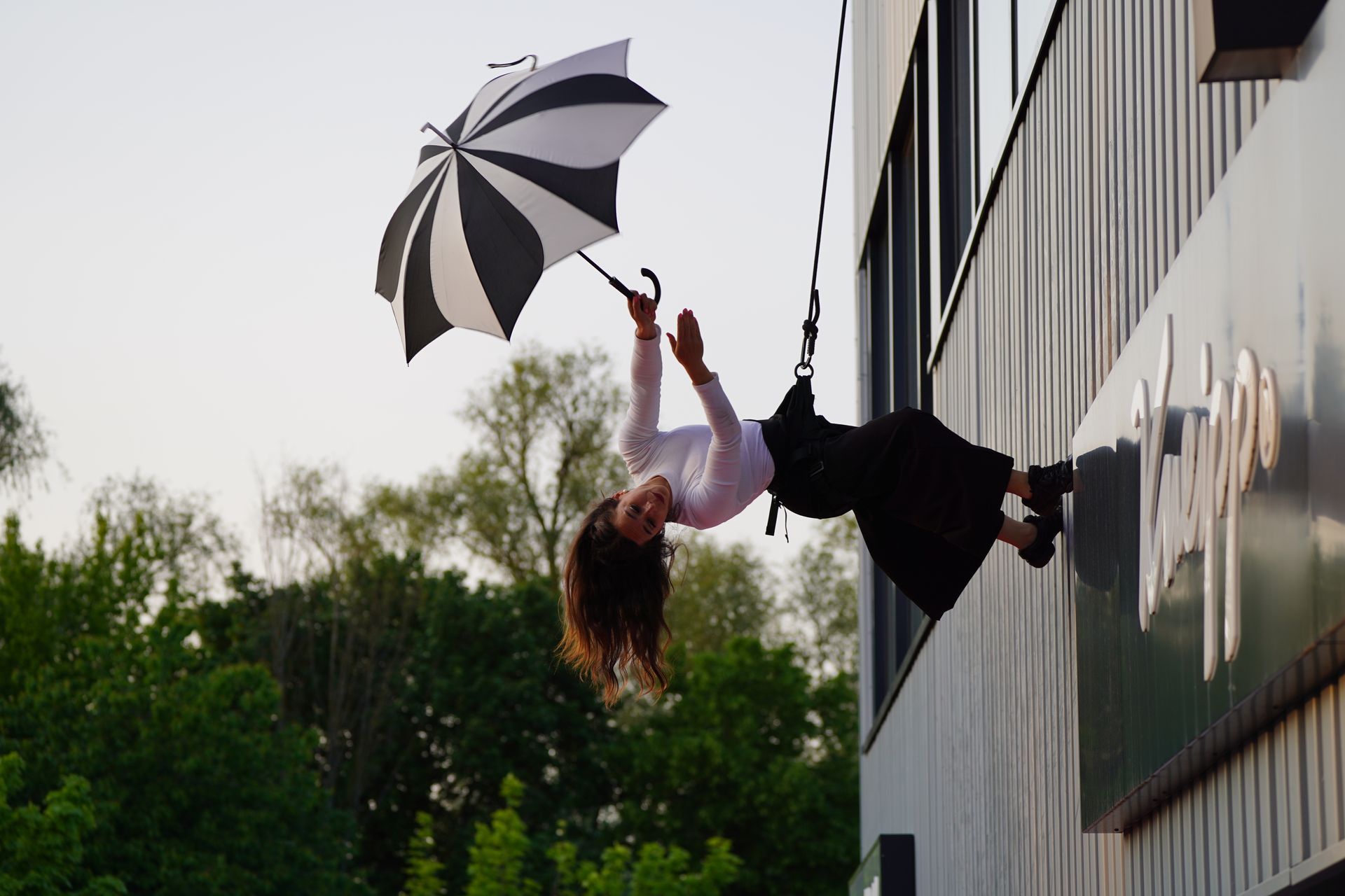 An Seilen gesichert tanzen unsere KünstlerInnen bei Ihrem Event an Gebäudewänden, durch den Raum oder an einem Kran.