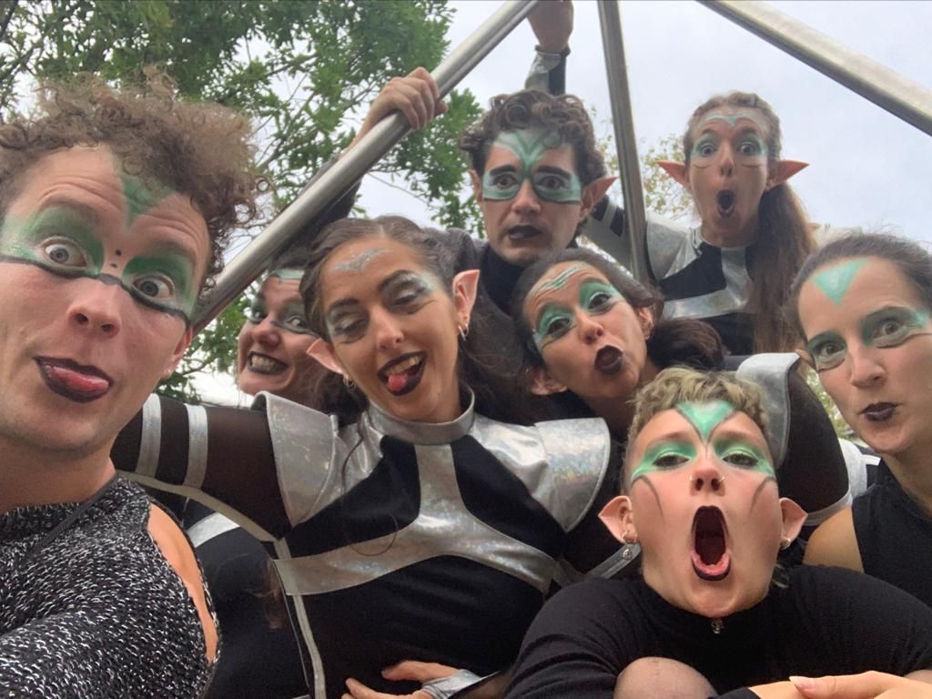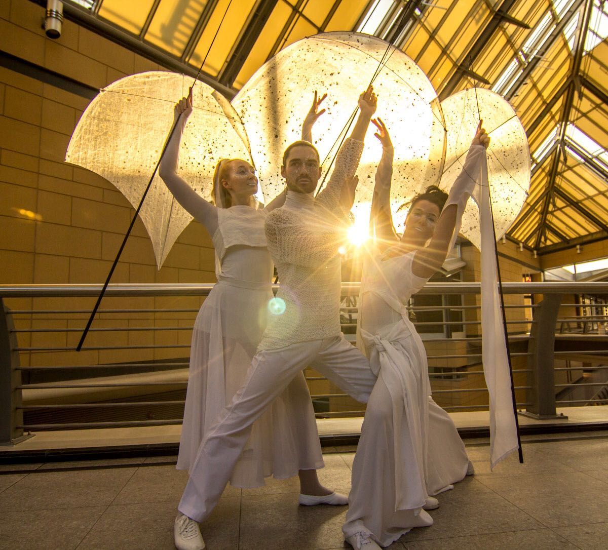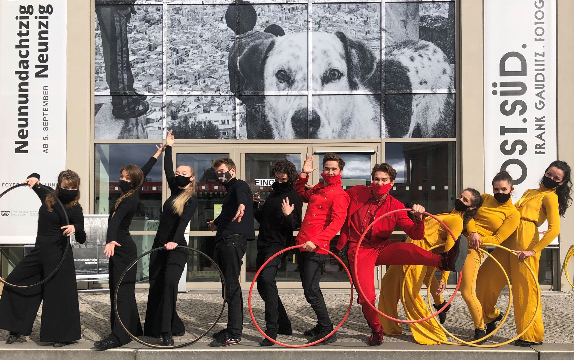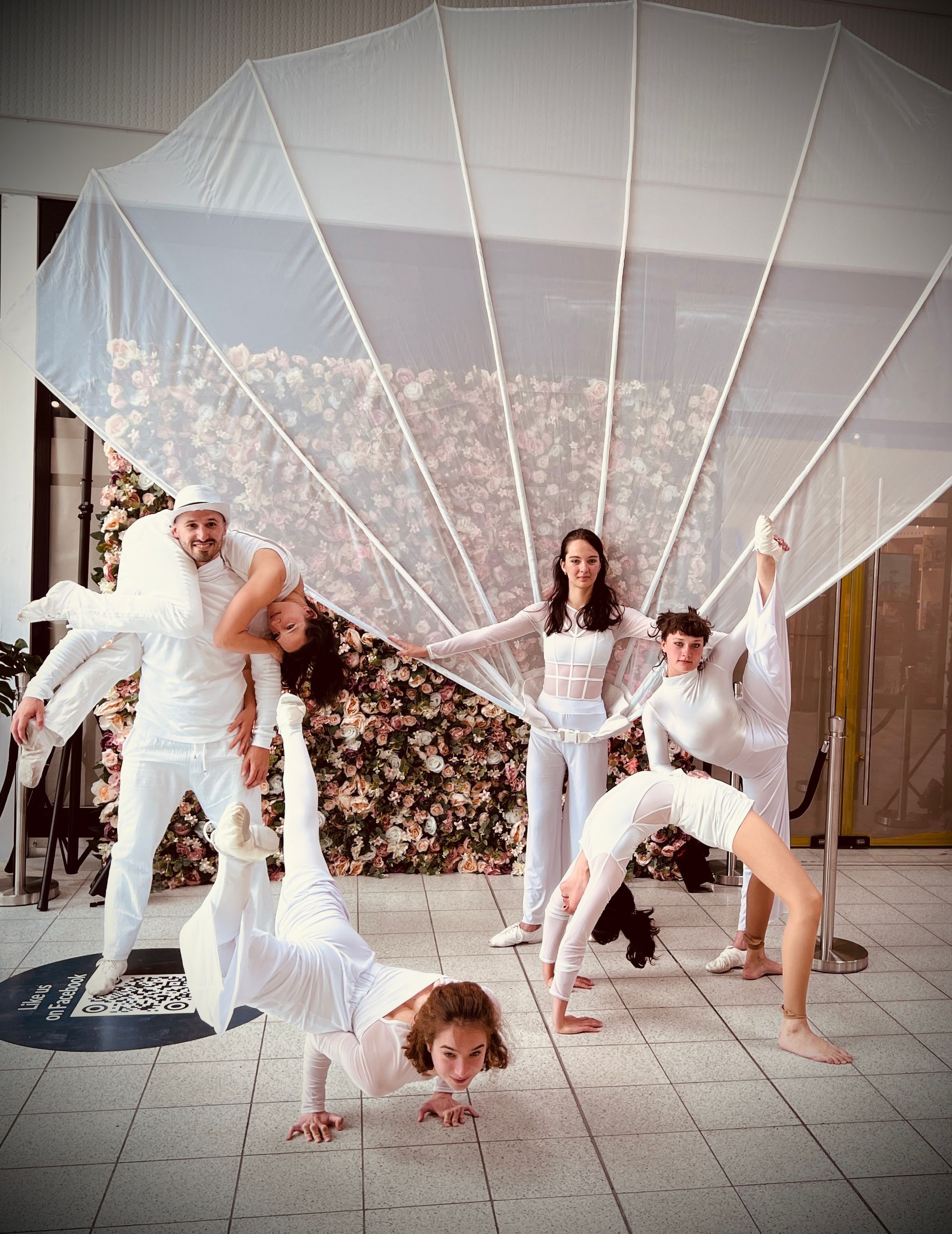 Sie bewegen sich tänzerisch-akrobatisch durch den Raum. Hier und da bleiben sie stehen, bilden Pyramiden, jonglieren oder machen Handstände. Sie verweilen für einen Augenblick, bevor sie wieder weiter ziehen.